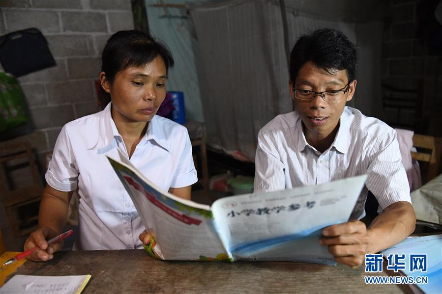 在广西天等县进远乡进远村龙坚屯,梁碧莹老师(左)和丈夫农志鹏老师在家里备课(2017年9月7日摄)。新华社记者 陆波岸 摄