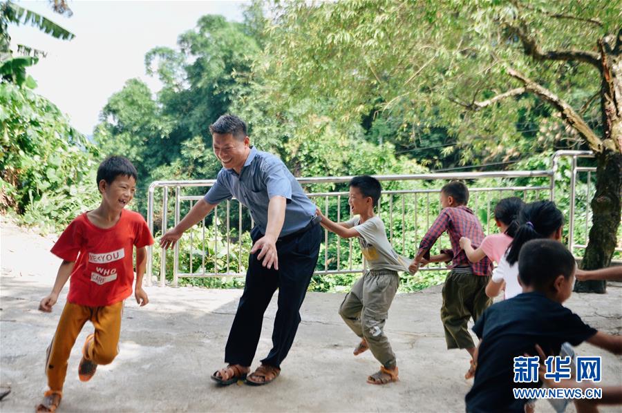 在广西崇左市宁明县爱店镇丈鸡教学点,蕉生定老师和学生们一起玩游戏(6月22日摄)。新华社记者 崔博文 摄