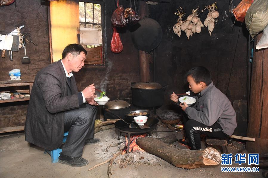 广西环江毛南族自治县龙岩乡朝阁小学老师刘显岳带学生周雄回家吃午饭(2019年12月4日摄)。新华社记者 陆波岸 摄