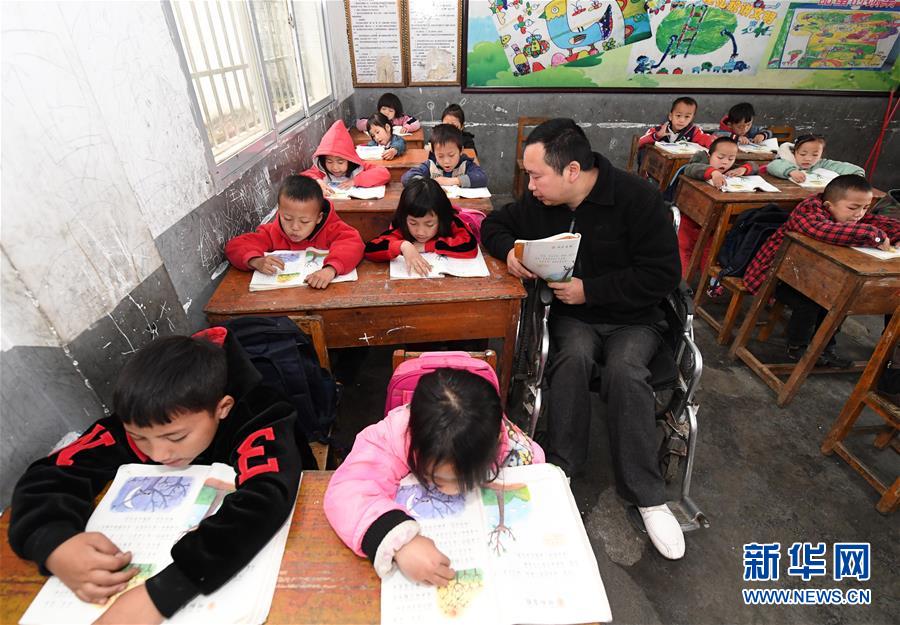 在广西凌云县下甲镇河洲村念恩小学,阮文凭老师在课堂上辅导学生功课(2019年3月26日摄)。新华社记者 陆波岸 摄
