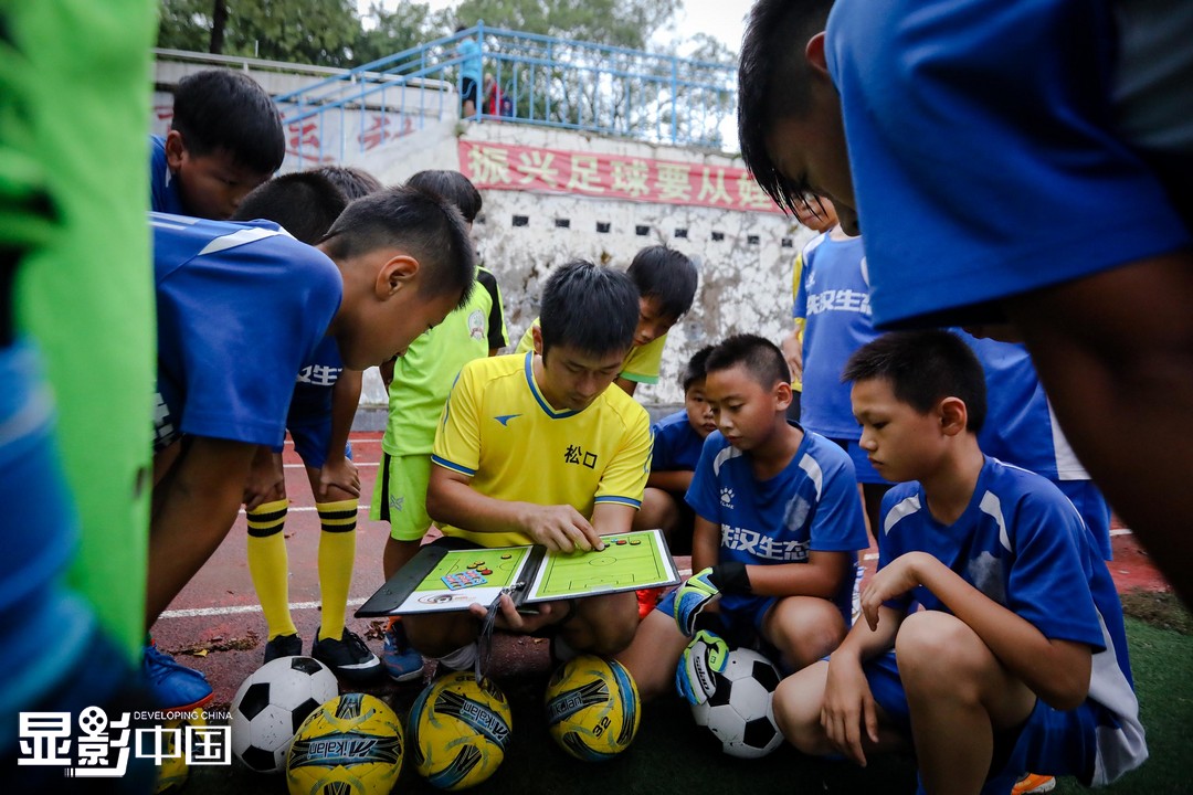 一身黄色运动服、一把口哨、一双球鞋,在绿油油的操场上,指挥着学生们操练,他是广东省梅州市梅县区松口镇中心小学的体育老师张凯新。图为张凯新为学生们讲解足球战术。新华网 李相博/摄 李幸子/文