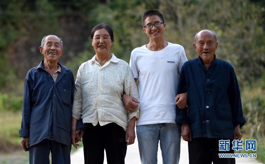 王新富(右二)和岳父(左一)、岳母(左二)及祖父在一起(9月8日摄)。