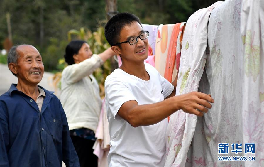王新富(右一)和岳父母收起晾晒的被褥(9月8日摄)。 新华社记者 刘潇 摄