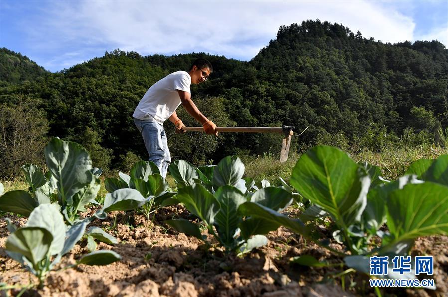 王新富在洪水过后补种的蔬菜地里忙碌(9月8日摄)。 新华社记者 刘潇 摄