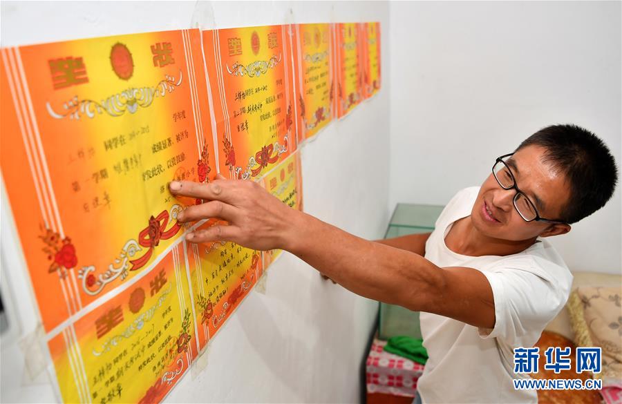 王新富在介绍女儿获得的奖状(9月8日摄),目前在县城寄宿学校上初中的女儿是王新富最大的骄傲。 新华社记者 刘潇 摄