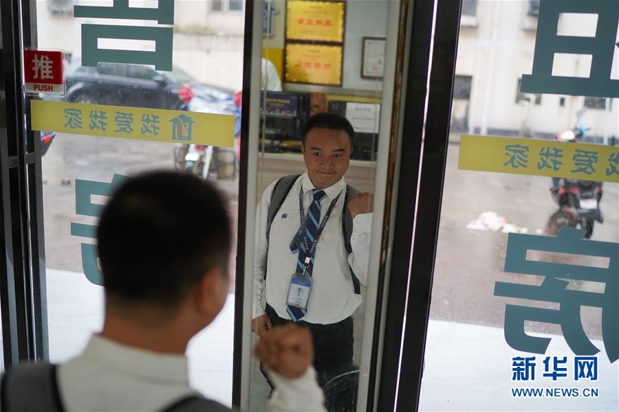 9月10日,外出洽谈业务前,尧涛对着镜子给自己鼓劲。 36岁的尧涛是江西南昌人,因出生时小腿发育不良并缺少腿骨,30多年来他只能用膝盖“跪着”走路。生活的不幸没有击垮尧涛,当地残联等政府部门曾为他提供过工作岗位,但天性乐观的尧涛却选择自己应聘,成为了一名房产中介。他每天带着客户爬楼看房,最多时一天步数可达2万步。虽然辛苦,尧涛却乐在其中,他说:“我的腿虽然是‘软的’,但我的腰杆是硬的,我一样会活出我的精彩!” 新华社记者 周密 摄