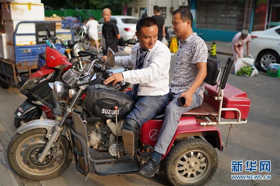 尧涛驾驶着残疾人专用摩托车带客户去看房(9月9日摄)。 36岁的尧涛是江西南昌人,因出生时小腿发育不良并缺少腿骨,30多年来他只能用膝盖“跪着”走路。生活的不幸没有击垮尧涛,当地残联等政府部门曾为他提供过工作岗位,但天性乐观的尧涛却选择自己应聘,成为了一名房产中介。他每天带着客户爬楼看房,最多时一天步数可达2万步。虽然辛苦,尧涛却乐在其中,他说:“我的腿虽然是‘软的’,但我的腰杆是硬的,我一样会活出我的精彩!” 新华社记者 周密 摄