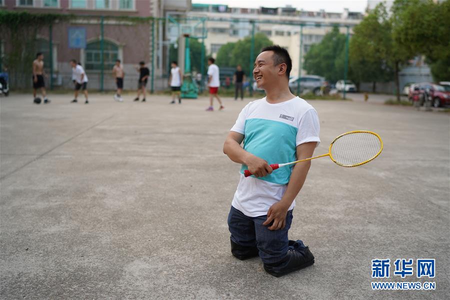 尧涛在打羽毛球(9月9日摄)。 36岁的尧涛是江西南昌人,因出生时小腿发育不良并缺少腿骨,30多年来他只能用膝盖“跪着”走路。生活的不幸没有击垮尧涛,当地残联等政府部门曾为他提供过工作岗位,但天性乐观的尧涛却选择自己应聘,成为了一名房产中介。他每天带着客户爬楼看房,最多时一天步数可达2万步。虽然辛苦,尧涛却乐在其中,他说:“我的腿虽然是‘软的’,但我的腰杆是硬的,我一样会活出我的精彩!” 新华社记者 周密 摄