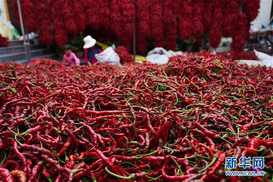 青海省循化撒拉族自治县清水乡田盖村村民在筛选采摘的辣椒(9月9日摄)。 新华社记者 吴刚 摄