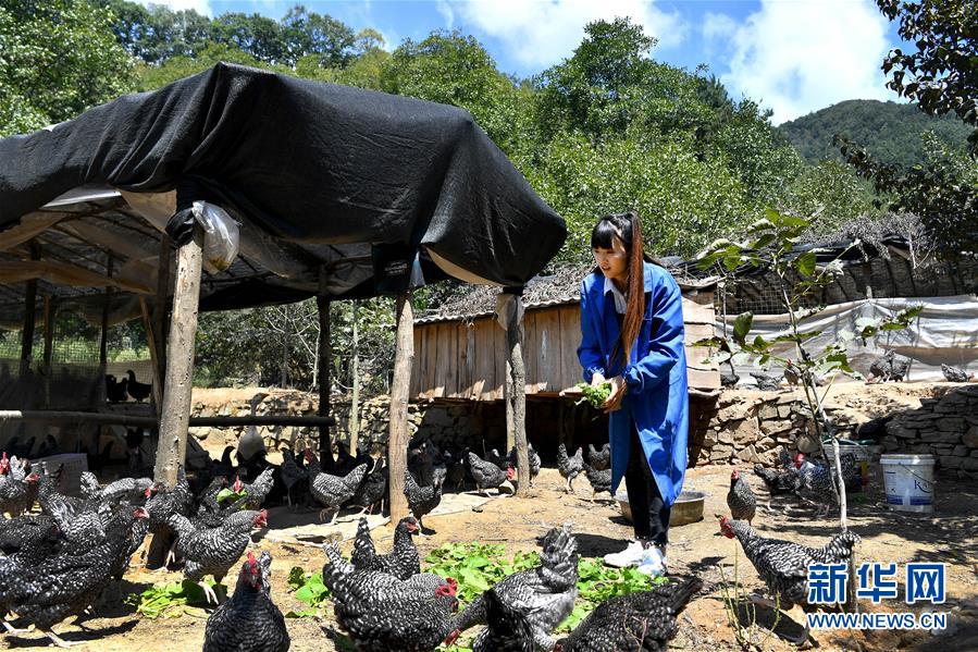 陕西省商洛市丹凤县寺坪镇寺坪村的李萌在给鸡喂食(9月10日摄)。新华社记者 刘潇 摄