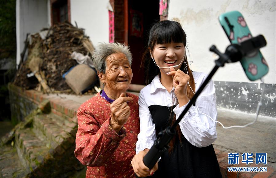 陕西省商洛市丹凤县寺坪镇寺坪村的李萌带着村里的留守老人一起直播(9月10日摄)。新华社记者 刘潇 摄