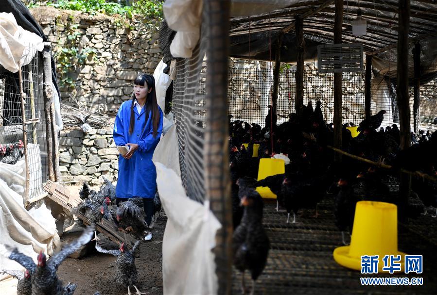 陕西省商洛市丹凤县寺坪镇寺坪村的李萌把鸡棚里的鸡唤出来散步(9月10日摄)。新华社记者 刘潇 摄