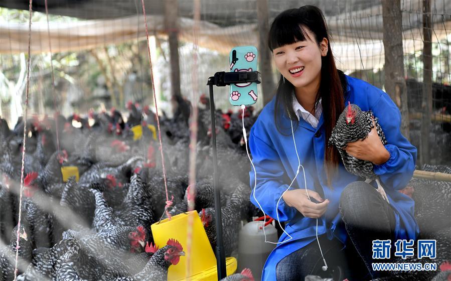 陕西省商洛市丹凤县寺坪镇寺坪村的李萌在自家的鸡棚里进行网络直播(9月10日摄)。新华社记者 刘潇 摄
