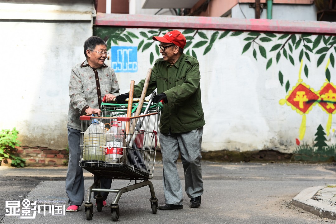 在沈阳市沈河区风雨坛街道文华社区,有一对年过八旬的老夫妻每天奔走在社区中,义务为小区中的花坛除草、浇水、打扫卫生。图为陈直(右)和老伴推着工具车准备打理社区中的花草。新华网 姜冰摄