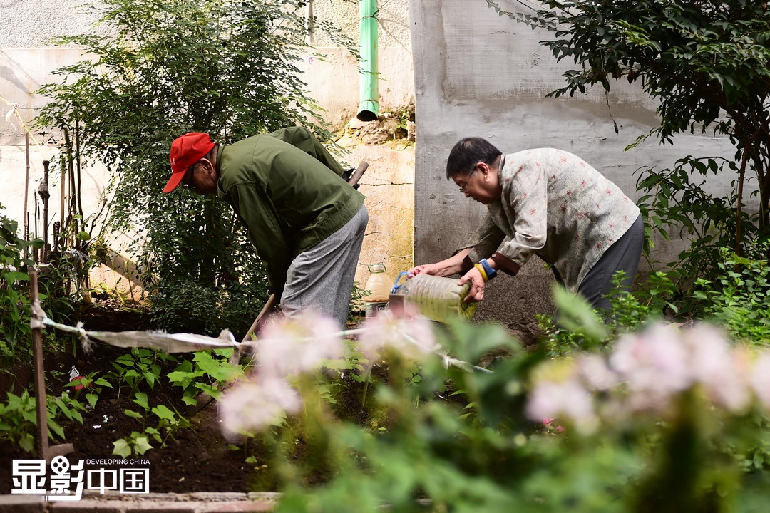 老人名叫陈直,今年81岁,老伴刘桂琴今年80岁,他们已经在文华社区生活了14年。文华社区中目前有十一处花坛,全部是陈直老两口十余年来亲手开垦种植的。图为陈直(左)和老伴在社区花坛中打理花草。新华网 姜冰摄