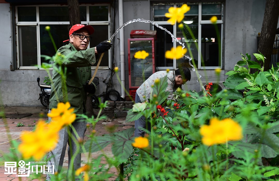 “我2006年搬到文华社区的时候,这里是老旧弃管小区,小区里环境不太好,也没有有序栽种的花草。我这个人特别喜欢花,退休了闲不住就主动找到社区,表达了我想在小区里种花的意愿,没想到我一说就得到了社区的大力支持。”陈直说。图为陈直(左)在为社区中的花浇水。新华网 姜冰摄