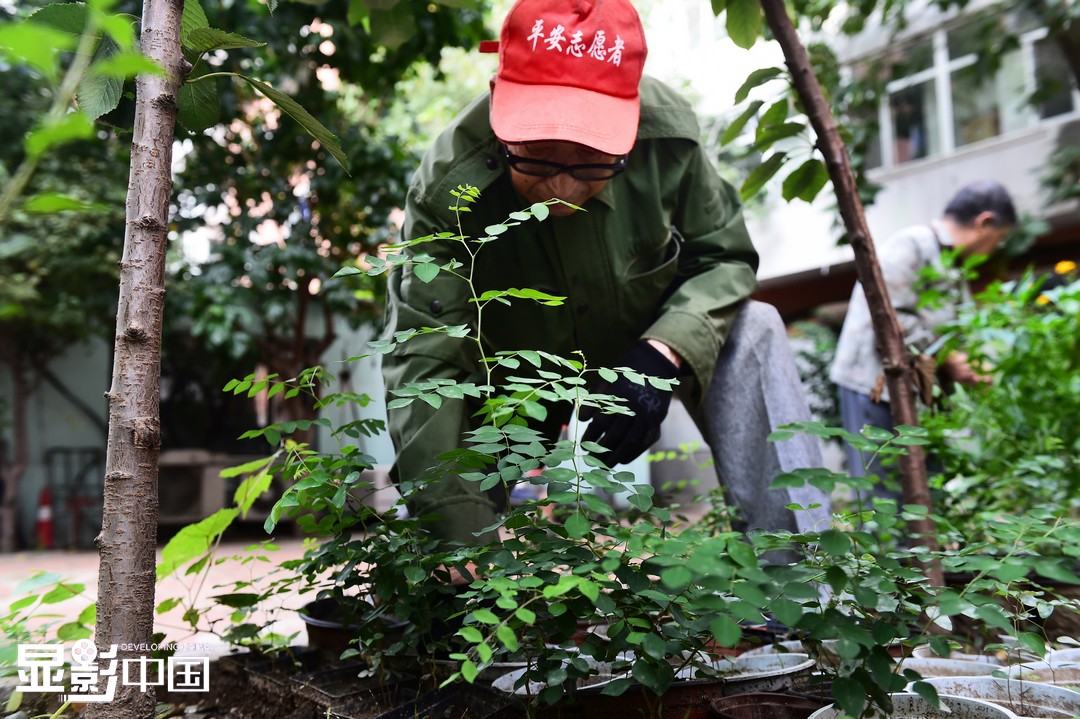 在征得社区同意后,陈直跟老伴就开始在社区里翻土、清理垃圾,规划花卉的种植区域。并自费购买了美人蕉、串红等花苗以及镐头、铁锹、水管等工具,开始了小区美化的进程。图为陈直在整理花苗。新华网 姜冰摄