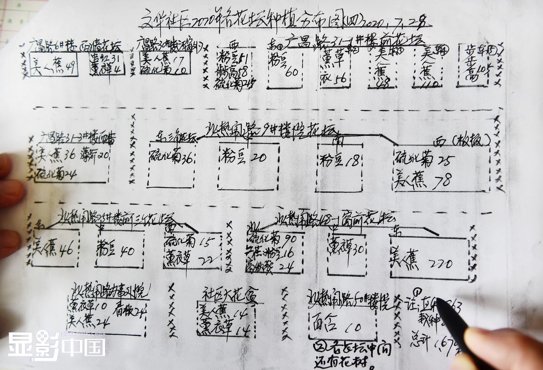 图为陈直在查看自己制作的社区各花坛种植分布图。新华网 姜冰摄