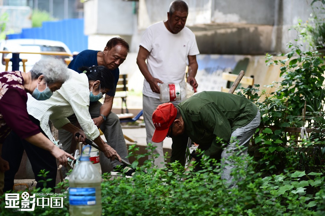 图为陈直(右一)与社区居民一起整理花坛。新华网 姜冰摄
