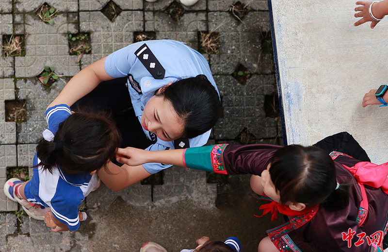2020年9月9日,广西柳州三江侗族自治县同乐乡中心小学开学,扶贫民警余建侠安慰一名哭鼻子的学生。(廖键人民视觉)