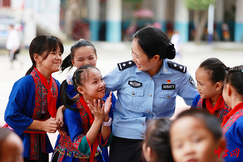 广西柳州,三江侗族自治县同乐乡中心小学开学,来自深圳边检总站的扶贫民警于洋、余建侠(女)与娃娃们手拉手奔向校园,笑声在山谷中回荡。