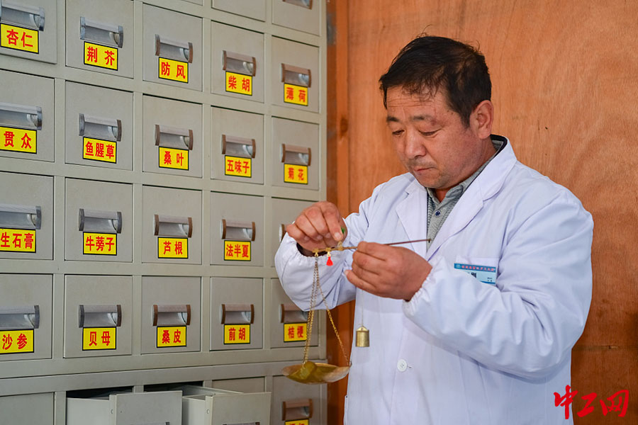 9月11日,宁夏中卫市海原县曹洼村,村医刘红刚在村卫生室为患者量取药材。(图片来源:视觉中国)
