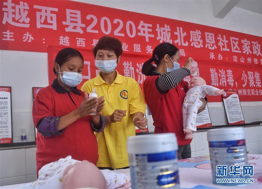 四川省凉山彝族自治州越西县城北感恩社区的妇女在接受家政服务培训(9月11日摄)。 当前,四川脱贫攻坚进入决战关头,最后的贫困堡垒全部位于大凉山腹地。然而近年来这里大部分青壮年外出务工,留守家园的妇女成为大凉山的重要劳动力。针对这一现象,各级政府多措并举,探索打造妇女居家灵活就业与传统优势手工业联动发展的模式,谋划了传统手工艺、公益性岗位、就近产业园务工等一系列适合妇女就业的举措。大凉山的妇女用勤劳的双手,撑起脱贫攻坚战场的“半边天”。 新华社记者 刘坤 摄