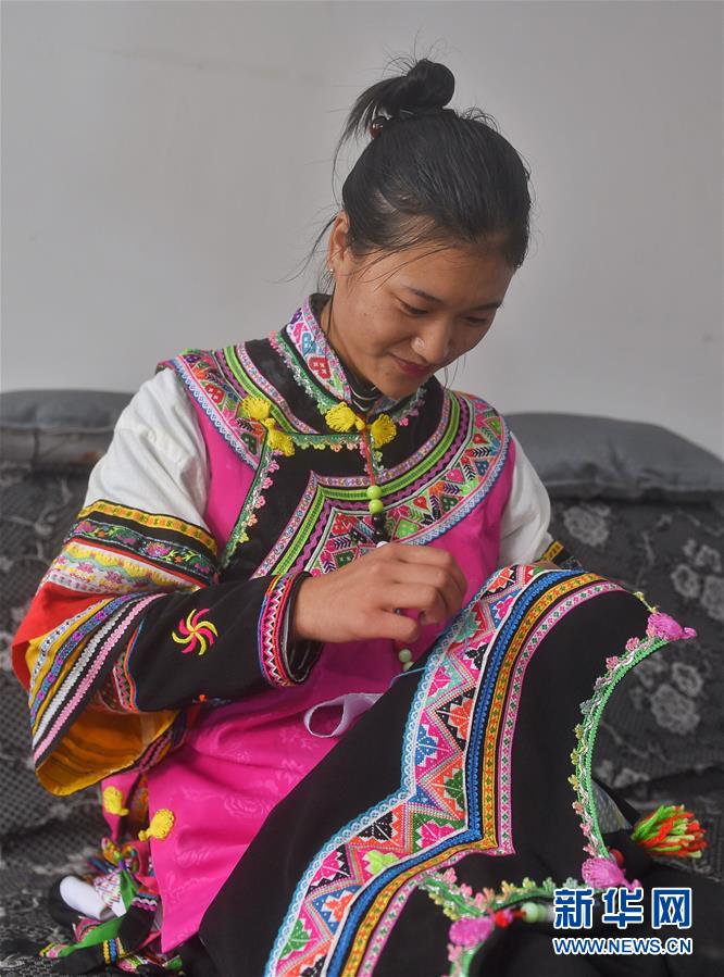 四川省凉山彝族自治州甘洛县蓼坪乡清水村的22岁姑娘王芳在家中绣制尔苏藏族传统服饰(9月10日摄)。 当前,四川脱贫攻坚进入决战关头,最后的贫困堡垒全部位于大凉山腹地。然而近年来这里大部分青壮年外出务工,留守家园的妇女成为大凉山的重要劳动力。针对这一现象,各级政府多措并举,探索打造妇女居家灵活就业与传统优势手工业联动发展的模式,谋划了传统手工艺、公益性岗位、就近产业园务工等一系列适合妇女就业的举措。大凉山的妇女用勤劳的双手,撑起脱贫攻坚战场的“半边天”。 新华社记者 刘坤 摄