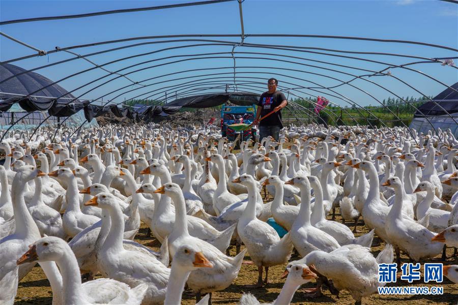 8月12日,在吉林省白城市镇赉县黑鱼泡镇岔台村,村民王木尧给鹅投喂饲料。新华社记者 张楠 摄