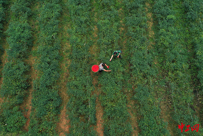 2020年9月11日,重庆市黔江区杉岭乡林峰社区“第一书记”杜建(右)在了解贫困户李贤余的辣椒收成情况。杨敏 视觉中国