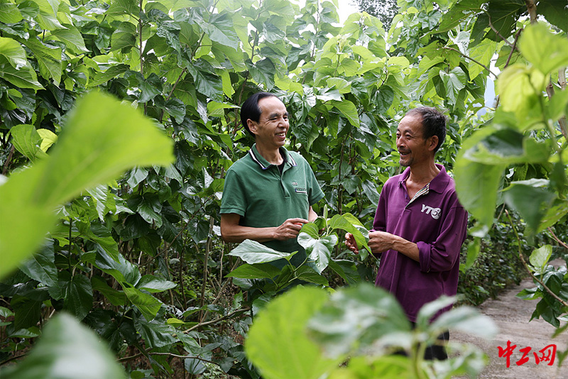 2020年9月11日,重庆市黔江区杉岭乡林峰社区“第一书记”杜建(左)给村民李贤明指导桑园的秋季管理。杨敏 视觉中国