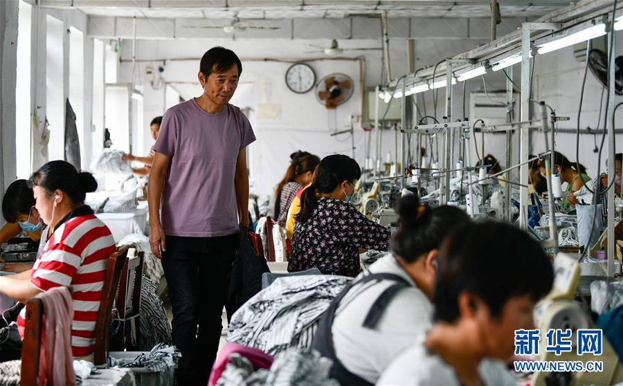 在天津市宁河区苗庄镇柳庄村,冯广有走访村里为解决妇女就业开设的服装加工厂(9月14日摄)。 新华社发(孙凡越 摄)
