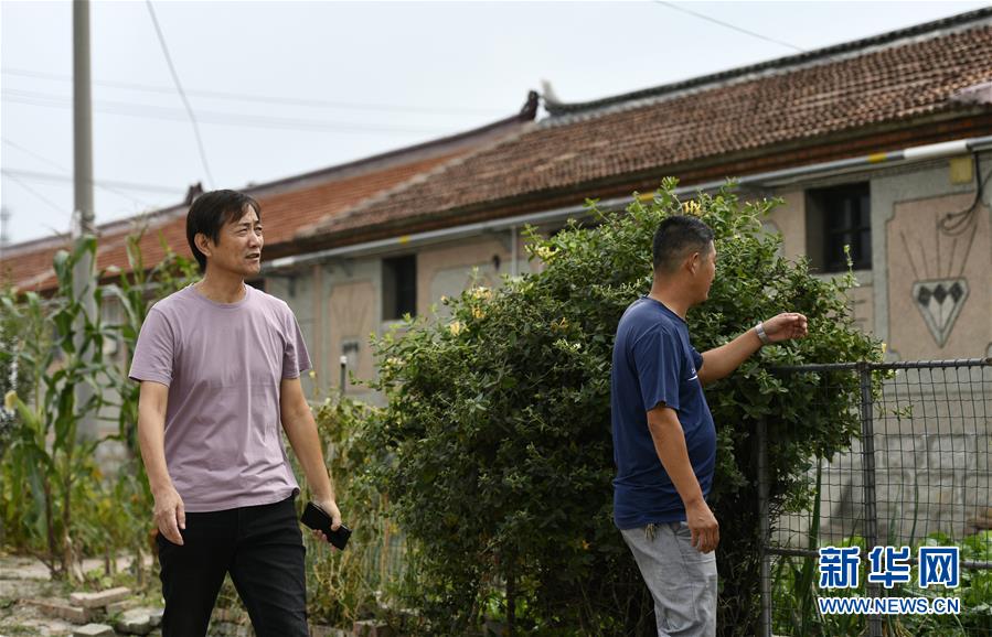 在天津市宁河区苗庄镇柳庄村,冯广有(左)准备入户了解情况(9月14日摄)。新华社记者 李然 摄