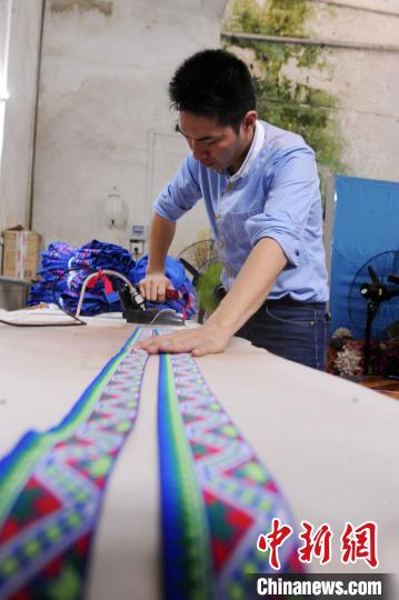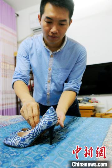 梁恒源展示加入壮锦元素制作的高跟鞋。 蒋雪林 摄