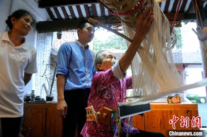 梁恒源与今年已经94岁的曾外祖母覃秀卿切磋织锦技艺。 蒋雪林 摄
