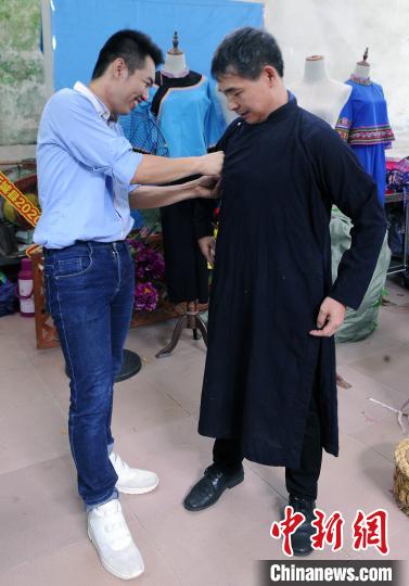 梁恒源给顾客试穿壮族传统男士服饰。 蒋雪林 摄