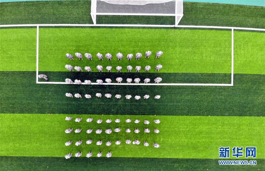 9月15日,王帅与同学们在东北林业大学操场上站军姿(无人机照片)。新华社记者王松摄