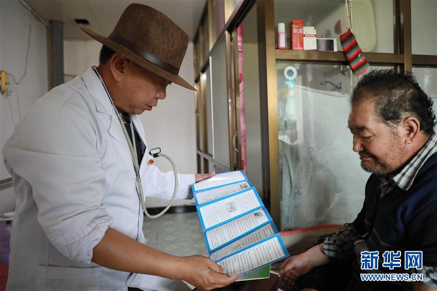 斗拉加(左)为村民王龙讲解健康卫生常识(9月15日摄)。新华社记者 央秀达珍 摄
