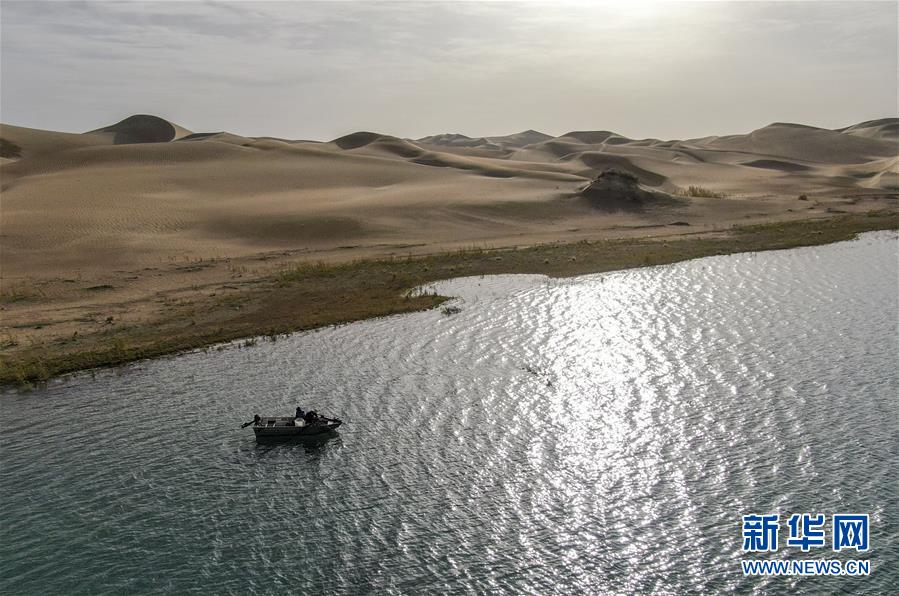 买买江·艾尼和段元杰在罗布湖上捕捞螃蟹(9月15日摄,无人机照片)。 新华社记者 赵戈 摄