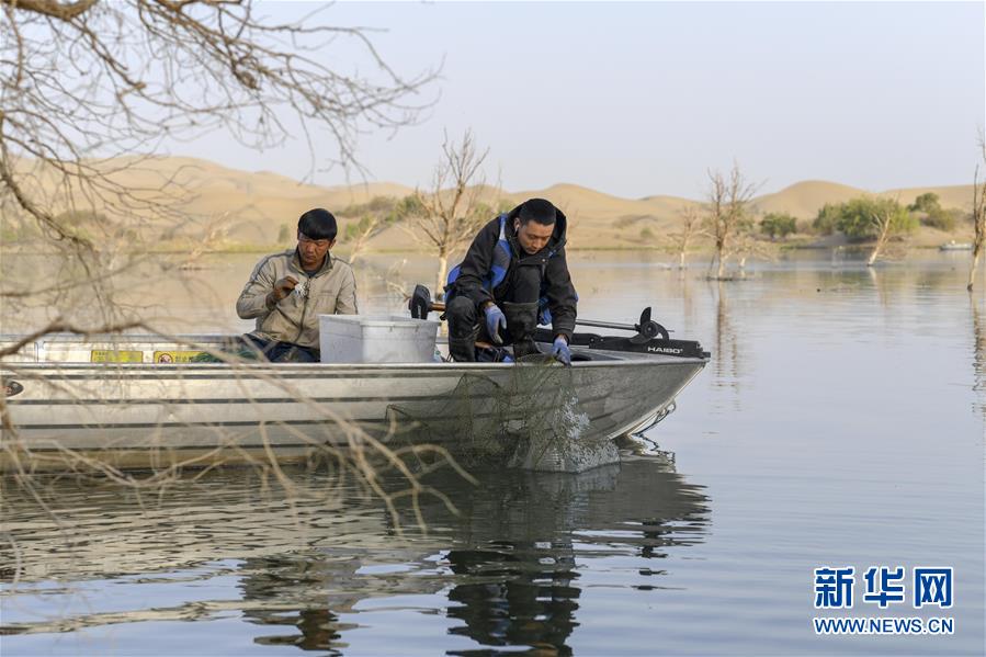 买买江·艾尼(左)和同事段元杰在罗布湖上捕捞螃蟹(9月15日摄)。 新华社记者 赵戈 摄