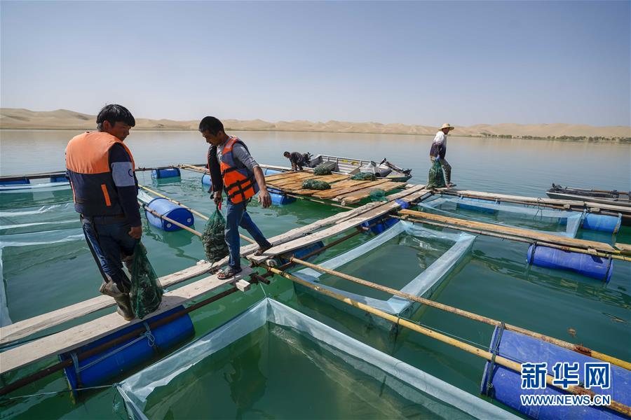 买买江·艾尼(左一)和同事们将刚抓的螃蟹放入用于临时存放螃蟹的网箱里(9月16日摄)。 新华社记者 赵戈 摄