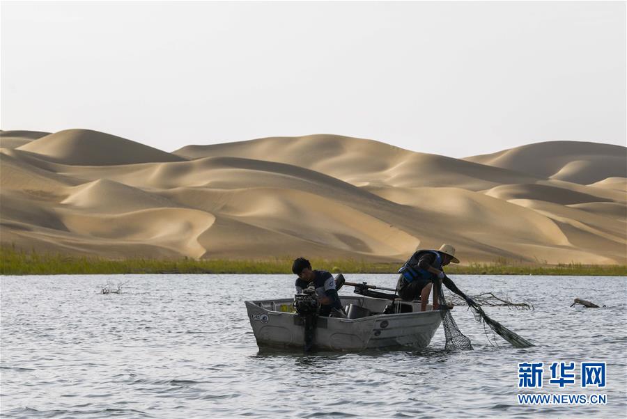 买买江·艾尼(左)和同事段元杰在罗布湖上捕捞螃蟹(9月15日摄)。 新华社记者 赵戈 摄