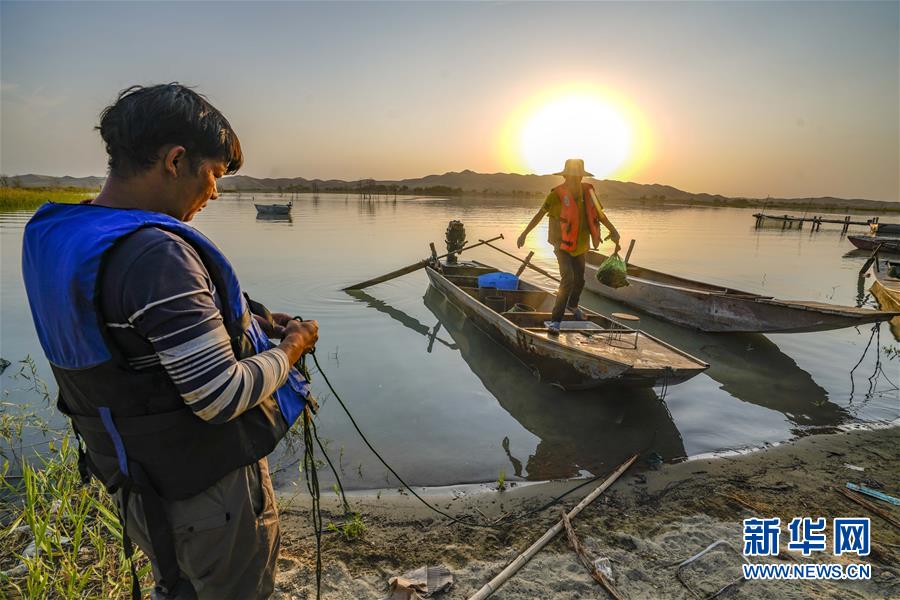 经过一天的忙碌,买买江·艾尼(左)和同事段元杰靠岸休息(9月14日摄)。 新华社记者 赵戈 摄