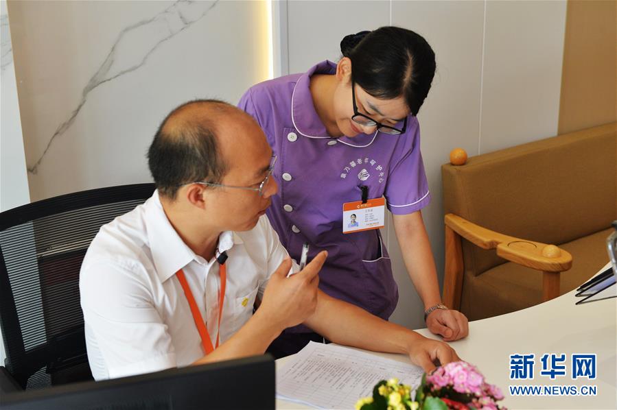 9月12日,在长沙市康乃馨老年呵护中心,王帝权(左)和同事王佳交流评估结果。新华社记者 戚晓毅 摄