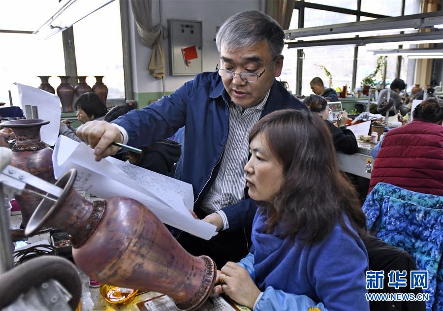 钟连盛——择一事终一生 钟连盛在和同事一起研究掐丝镶嵌工艺(1月20日摄)。 新华社记者 李欣 摄