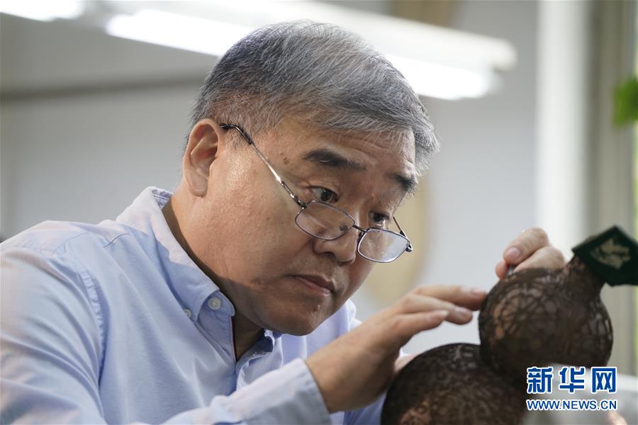 钟连盛在为景泰蓝作品进行掐丝镶嵌(9月15日摄)。 新华社记者 李欣 摄