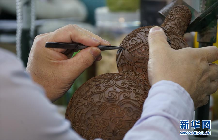 钟连盛在为景泰蓝作品进行掐丝镶嵌(9月15日摄)。 新华社记者 李欣 摄