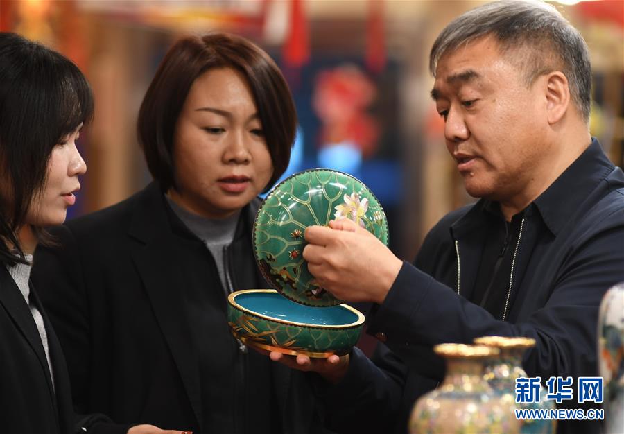 钟连盛和同事一起检测制作完成的景泰蓝艺术品(1月20日摄)。 新华社记者 李欣 摄