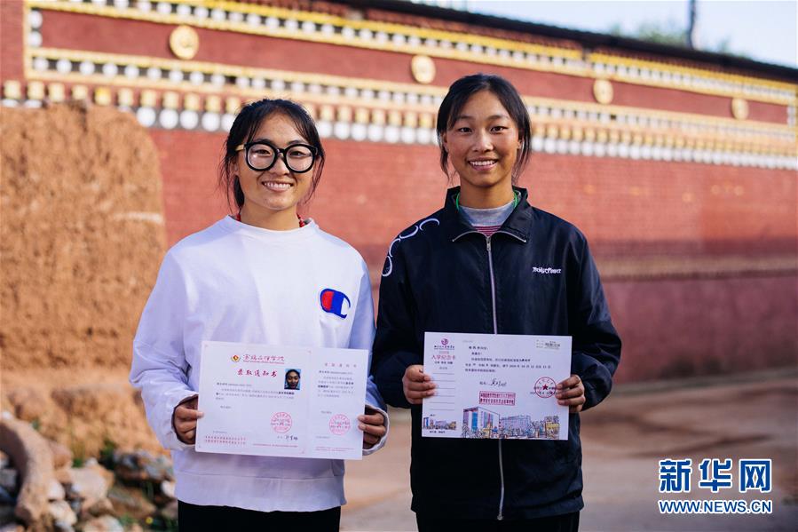 9月11日,在青海省化隆回族自治县金源藏族乡科上村,周毛卓玛和格热措(右)展示各自的大学录取通知书,姐妹俩分别被宝鸡文理学院和四川文化艺术学院录取。新华社记者 刘金海 摄