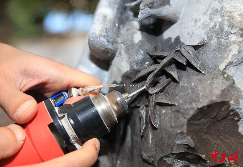 2020年9月21日,湖南张家界市桑植县化石石雕生产性保护示范基地,雕刻技师在加工制作化石石雕。吴勇兵/视觉中国